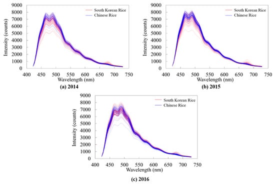 Figure 4 shows the fluorescence spectra of the South Korean and Chinese rice samples by year. The spectra of the rice samples from 2014 to 2016 show a similar trend in the entire wavelength range of 420 to 780 nm. The Chinese rice samples exhibit a higher reflectance than the South Korean rice samples at the overall spectral wavelength. Previous studies reported that the geographical origin can be discriminated by using the difference in the ratio of amylopectin to amylose in rice [23]. Generally, it has been reported that branched-chain amylopectin is identified by the crystallinity of the samples and is attenuated by the amount of amylose present [28]. In addition, a spectral difference appears owing to the apparent transparency and internal heterogeneity of the sample [29].