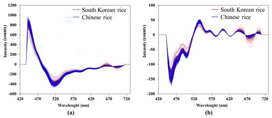 Average fluorescence spectra after pre-treatment application for the South Korean and Chinese rice samples: (a) first-order derivative and (b) second-order derivative.