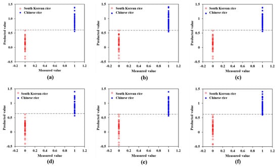 Geographical origin discrimination results for the PLS-DA models developed using (a) no pre-treatment, (b) baseline pre-treatment, (c) maximum normalization, (d) smoothing pre-treatment, (e) Savizky–Golay first-order derivative, and (f) Savizky–Golay second-order derivative.