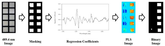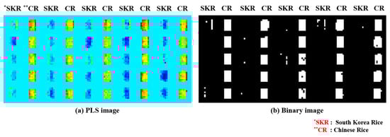 A PLS image algorithm for geographical origin discrimination was developed. The development process of the image processing algorithm is shown in Figure 7. Binarized images were obtained to remove the background of the HSI at a 489.4 nm wavelength. From that point, the images of all wavelength bands were masked for feature extraction of the rice samples. Regression coefficients of the PLS model were applied to all wavelength band images, followed by acquisition of the PLS images. The South Korean and Chinese rice samples were discriminated from the obtained binary image by applying a threshold value to the PLS image.