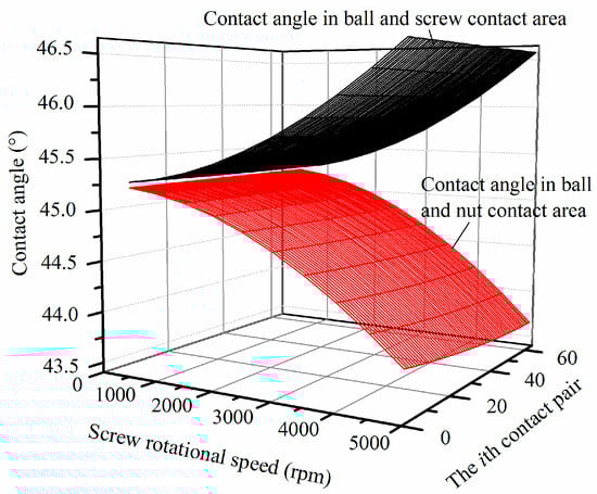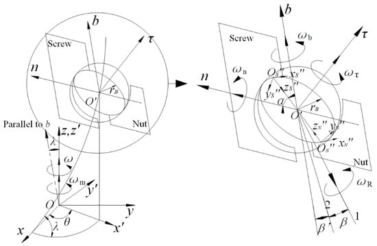 But the rotating screw will drive the balls to generate the angular velocity of the revolution around screw axis and the angular velocity of the ball rotation, respectively, which will make the balls produce outward centrifugal force , and produce the transverse frictional force and longitudinal frictional force along the contact surface, which leads to the contact angles of the nut and screw being no longer equal, that is . The directions of and are along the and axes, respectively.