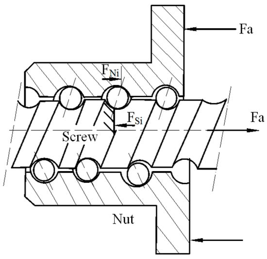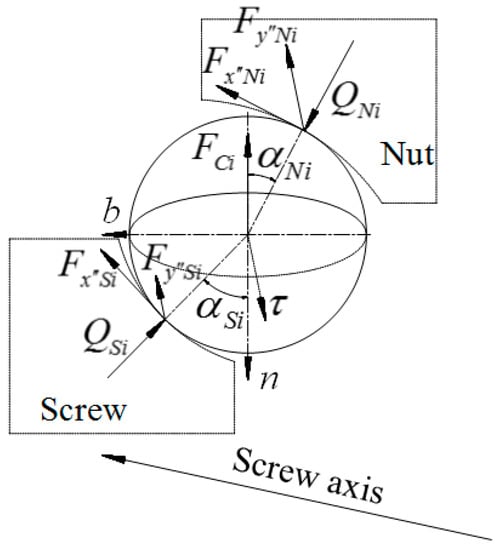 As demonstrated in Figure 3, the frictional force between the ball and the screw and nut can be decomposed into two directional components in CS: the direction (transverse) frictional force and the direction (longitudinal) frictional force. The formula can be expressed as []: