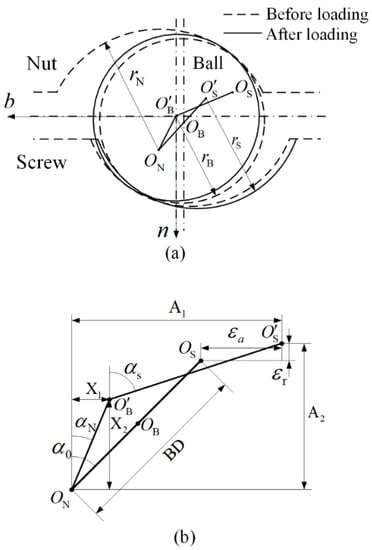 As a high-speed ball screw nut pair, on the one hand, it mainly bears axial force during operation. On the other hand, the influence of centrifugal force caused by the high-speed rotation of the ball should also be considered. The effect of contact angle, contact force and centrifugal force is considered comprehensively, and the deformation is shown in Figure 6a [,]. For analyzing the motion state and deformation of the ball screw nut pair in the motion process, the center of the nut raceway is fixed. As shown in Figure 6b, when the preload is not considered, there is no force between the ball and the screw and nut raceway before the SNBSP under load. So, there is no contact deformation, and the ball center is aligned with the screw and nut raceway curvature center. The internal and external contact angles on both sides of the ball and the raceway are the initial design angle . When the ball screw is bearing a load, due to internal (screw) and external (nut) contact force and the centrifugal force and the influence of internal and external contact deformation, the ball center moves from the point to , the screw raceway curvature center moves from the point to , and the contact angles of the ball and screw raceway and nut raceway change from to and , respectively.