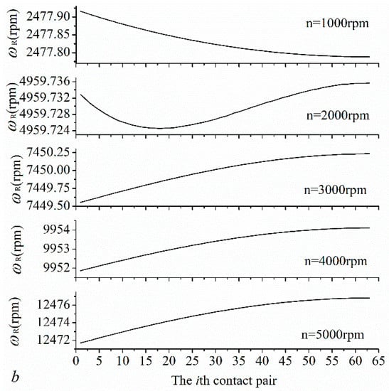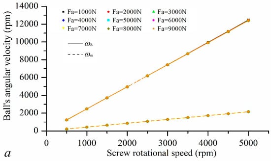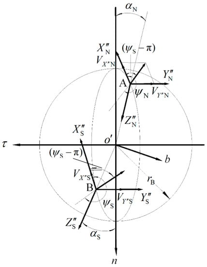 where and denote the component of the angular velocity of the ball rolling in the direction of the t-, n- and b- axis in CS, respectively. The calculation process of and can be obtained in reference [], so there is no repeat on it. The direction of each velocity is shown in Figure 2.