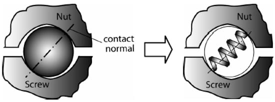 In the dynamic contact stiffness model, the rolling element is usually regarded as a spring without mass, which is connected along the contact point with the screw and nut raceway (Figure 8).