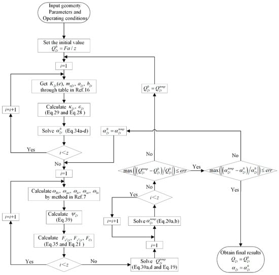 Firstly, the initial value η0 is given according to the classical equation of transmission efficiency. According to Equation (47) in this paper, Fa0 is calculated. The parameters such as Fa0 and screw speed are substituted into the dynamic contact model, and results such as and are obtained. Substituting the results into Equations (A1)–(A5), is obtained. According to Equation (47), the axial force is calculated. The error of the temporary value and the initial value of and are compared, respectively, and the iterative solution is carried out until the accuracy requirements are met. Finally, and Fa are obtained.