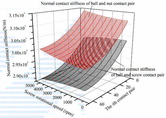 Stiffness refers to the ability of the material to resist the deformation of external forces. When the ball is in contact with the internal and external raceway, the screw raceway and the nut raceway all have contact deformation. For the ith ball, its normal contact stiffness with the raceway is represented as [].