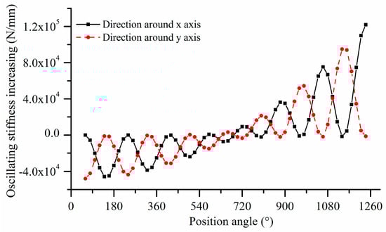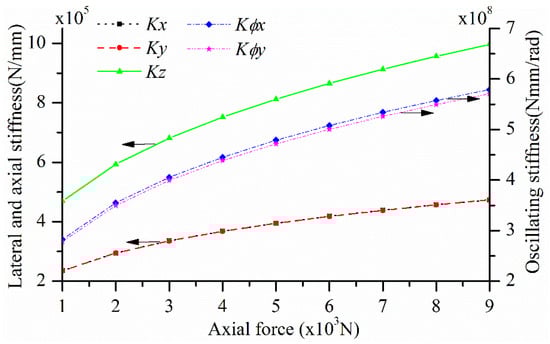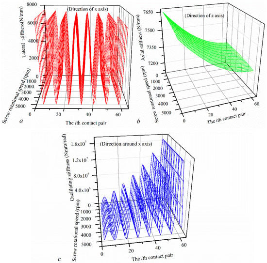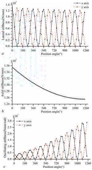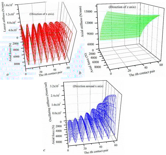 The leading diagonal elements reflect the local variation of contact pairs. Therefore, the concept of local contact stiffness is proposed in this paper. The expression of local contact stiffness in all directions is shown in Equation (45). are the local lateral stiffness. is the local axial stiffness. are the local oscillating stiffness.