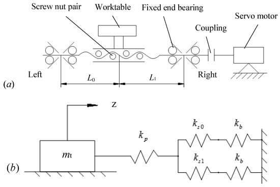 Machining accuracy is a key feature to measure the overall performance of CNC machine tools. Ball screws are widely used in CNC machine tool feed systems because they have great stiffness, small axial clearance, high bearing capacity and low frictional force []. Although the ball screws have used in CNC machine tool systems for many years, the contact parameters of the screw nut pair, especially dynamic contact stiffness for keeping the feed system’s positioning accuracy and precision, are still not fully explained.