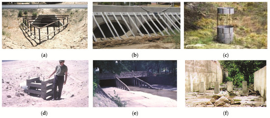 Debris control structures: (a) deflector; (b) rack; (c) riser; (d) crib; (e) fin; (f) dam [35].