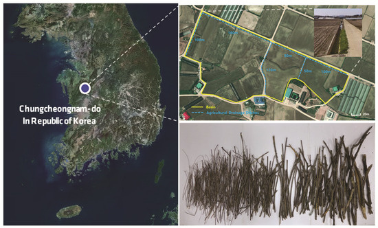 Regarding debris in agricultural drainage ditches, there are no clear standards for size or type except the suggestions of the FHWA [35], which classifies small twigs and wood chips as LFD [35]. This study presents a definition of driftwood in agricultural drainage ditches in order to help develop a driftwood capture trellis. The study looks at agricultural drainage ditches in the plains region in Chungcheongnam-do, Korea. Topographically, Chungcheongnam-do is the lowest area in Korea, with an average altitude of less than 100 m. It has an average annual temperature of 11–13 °C, and average annual rainfall of 1100–1350 mm. The basin area of agricultural drainage ditches where driftwood is collected is 3.67 ha. Agricultural drainage ditches located in the target region are square-shaped with a width of 400 mm and are installed in concrete. The circumference of the target region is about 1 km, and agricultural drainage ditches are installed around 600 m. For this study, twigs and wood chips were collected within 1 km of the agricultural area, in and around the location of agricultural drainage ditches (Figure 2).