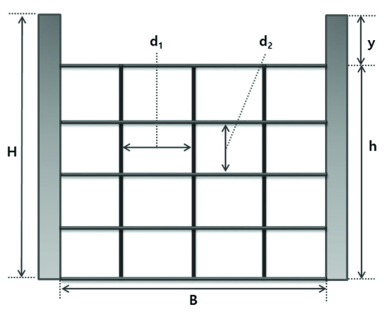 As mentioned above, the driftwood capture trellis for agricultural drainage ditches suggested in this study was developed considering various design criteria. The parameters of the agricultural drainage ditch system are as follows: drainage width (B), drainage height (H), opening height (h), overflow height (y), horizontal net distance (d1), and vertical net distance (d2). A schematic design of the driftwood capture trellis is shown in Figure 3.