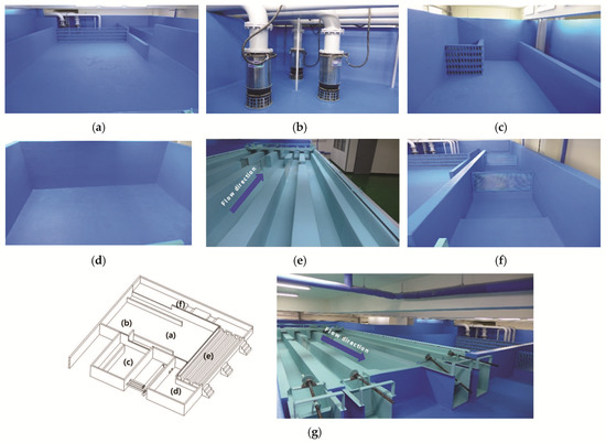 Hydraulic lab used to study agricultural drainage ditches: (a) water tank; (b) pump station; (c) head tank; (d) rectifying tank; (e) agricultural drainage ditches (400 mm); (f) return tank; (g) plan view.