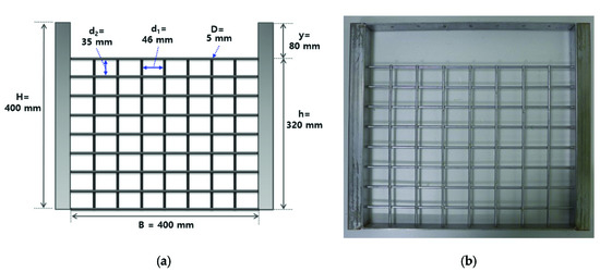 As mentioned above, the driftwood flow of the driftwood capture trellis designed in this study was developed considering various design criteria. A 400 mm wide agricultural drainage ditch was installed in the hydraulic laboratory along with a driftwood capture trellis with overflow height, opening height, and horizontal and vertical net distance as suggested in the design plan. The driftwood capture trellis was a square 400 mm in length, 80 mm in overflow height, 320 mm in opening height, 46 mm in horizontal net distance, and 35 mm in vertical net distance, with barriers 5 mm in diameter. The barriers were designed in an 8 × 8 grid, with horizontal and vertical net distances in the range of 1.0 to 2.0 times the maximum diameter of the driftwood, or between 25 and 50 mm. The driftwood capture trellis for agricultural drainage ditches developed in this study is shown in Figure 5.