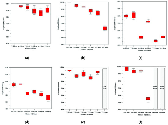Capture efficiency of the driftwood capture trellis according to depth: (a) H = 80 mm; (b) H = 120 mm; (c) H = 160 mm; (d) H = 200 mm; (e) H = 240 mm; (f) H = 280 mm.