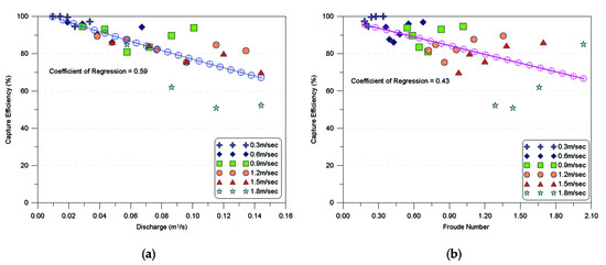 Capture efficiency of the driftwood capture trellis by hydraulic characteristics: (a) capture efficiency by discharge; (b) capture efficiency by Froude number.