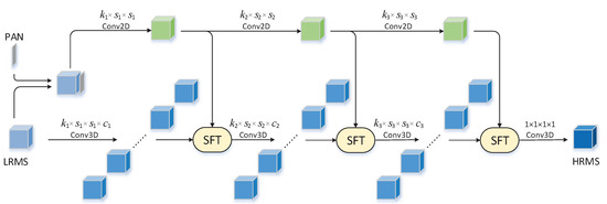 Apart from the 3D convolution operation for convolution layers, the SFT strategy is also introduced in the approximate branch of SA-PNN (as show in Figure 1). SFT is originally designed to acquire the semantic categorical prior for color image enhancement [43]. We argue here that SFT can be used to adaptively adjust spectra in terms of the observed scene, to play a crucial role in the detail injection; and for the first time (to the best of our knowledge), to introduce it into pansharpening task. More specifically, in our SA-PNN, SFT provides an affine transformation for the convolutional feature maps based on a modulation parameter pair , where and are parameter maps conditioned on the observed scene. The transformation is carried out by a scaling and shifting operation as follows: