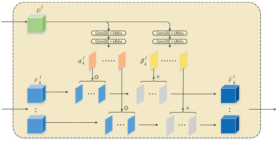 where denotes the feature maps and ⊙ represents element-wise multiplication. As shown in Figure 2, for the lth layer in the approximation branch, we first obtain a modulation parameter pair from the feature maps of the lth convolutional layer (the lth green cube in Figure 2). Then, we apply the element-wise affine transformation to the feature maps (the lth blue cubes in Figure 2) according to (4):