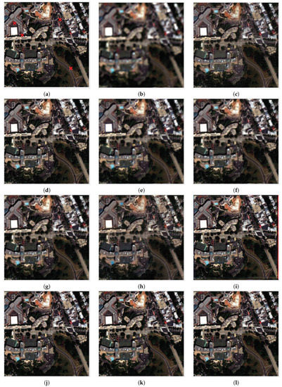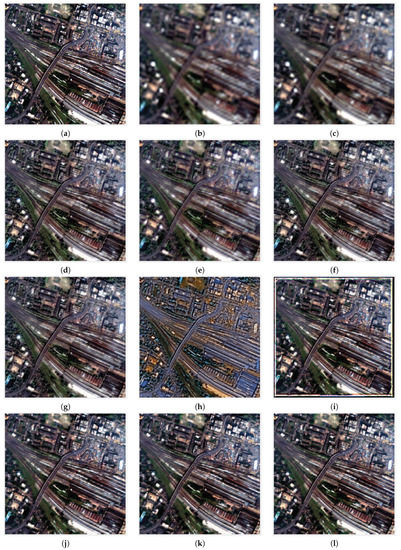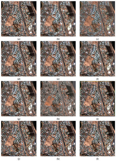 Pansharpening results for the WorldView-2 dataset: (a) ground truth; (b) polynomial kernel (EXP); (c) principal component analysis (PCA); (d) Gram–Schmidt adaptive (GSA); (e) partial replacement adaptive component substitution (PRACS); (f) à trous wavelet transform (ATWT); (g) Generalized Laplacian Pyramid with High-Pass Filtering (MTF-GLP-HPM); (h) coupled nonnegative matrix factorization (CNMF); (i) pansharpening CNN (PNN); (j) deep residual pansharpening neural network (DRPNN); (k) detail injection-based pansharpening CNN (DiCNN1); and (l) spectral-aware pansharpening neural network (SA-PNN).