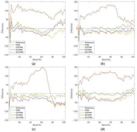 Spectral difference curves between the ground truth and the pansharpening results for the Pavia dataset at randomly selected spatial coordinates: (a) (27, 68); (b) (125, 68); (c) (11, 12); and (d) (131, 8), which are marked in Figure 7a with red crosses.