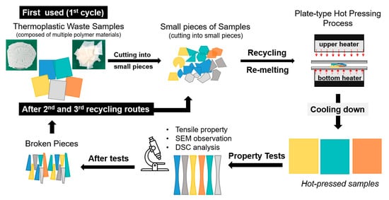 In this study, we consider two main waste compound groups—T/P blends and T/P/MA blends; one is composed of thermoplastic polyurethane (T) and polypropylene (P), and the other one additionally contains maleic anhydride grafted polypropylene (MA). The waste materials originate from our laboratory; these are materials that have been used for mechanical tests in previous studies. It can be regarded as used materials that require suitable treatment. From Figure 1, following the recycling routes for these T/P and T/P/MA blends, the materials are first trimmed into small pieces, mixed, and hot-pressed to form the blends beforehand. The blending ratios of T/P and T/P/MA blends are 90/10/0, 90/10/5, 70/30/0, 70/30/5, 50/50/0, and 50/50/5, and Table 1 displays the corresponding denotations of the samples.