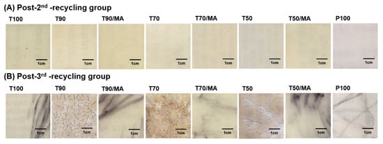Figure 2A,B shows the appearance variation of T/P blends and T/P/MA blends as related to the post-2nd and post-3rd recycling, respectively. In Figure 2A, blends that are composed of a greater T content appear in dark yellow, while blends that are composed of a greater P content appear in lighter yellow, according to the comparison between the images of T90 and T70. The yellowing phenomena can be ascribed to the oxidation reaction of thermoplastic polyurethane during the recycling processes [31,32]. Based on the results of melt-recycling, T/P/MA blends are more easily and efficiently hot-pressed than T/P blends (i.e., MA-free blends). As MA serves a bridging role that can improve the original interfacial property between T and P, it well attenuates the interfacial tension. It has been proven that a proper compatible agent for a multiple-polymer system is desirable, where the original system without a compatible agent was with poor performance and limited application [27]. Figure 2B shows that P100 and T100 waste-blended samples do not show distinct defects in the post-3rd-recycling process and still maintain good formability. It is a good piece of evidence that the thermoplastic materials can be well reformed within an appropriate treatment. At the same time, the MA-containing blends also have stable formability and can be hot-pressed efficiently. With a greater number of melting–recycling cycles, MA provides T/P matrices with significant compatibility and stability. As for MA-free blends, the images of T90, T70, and T50 in Figure 2B exhibit distinctive pores and defects. The phenomenon results from melting–recycling cycles, in which the variation of thermal energy may escalate the incompatibility and immiscibility between T and P. Moreover, phase separation becomes apparent and forms larger defects on the T/P blends with increasing content of polypropylene. Furthermore, the larger the content value difference between T and P, the more significant the differentiation effect. On the other hand, the MA-containing groups (T90/MA, T70/MA, and T50/MA) show a reverse result, where the presence of MA makes a contribution to stable formability regardless of multiple melting–recycling cycles, which suggests that the feasibility of multiple utilization is increased considerably.
