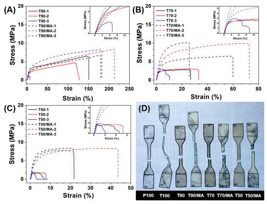 Figure 4 shows the stress–strain curves and stereomicroscopic images of T/P and T/P/MA blends after tensile test and the corresponding denotations are listed in Table 1. Figure 4A–C shows the tensile properties of T90, T70, and T50, as related to whether MA is added, namely, T90/MA, T70/MA, and T50/MA. Figure 4D shows the stereomicroscopic image of the expanded T/P blends. In Figure 4A–C, the black curve means samples are treated with one-off hot-pressing, while the red and blue curves, separately, mean samples are treated with post-2nd- and post-3rd-recycling and the resulting samples are compared, thereby examining the reclamation efficacy of T/P blends. Meanwhile, the solid lines represent the MA-free groups, while the dotted lines represent the 5 wt % MA-containing groups.