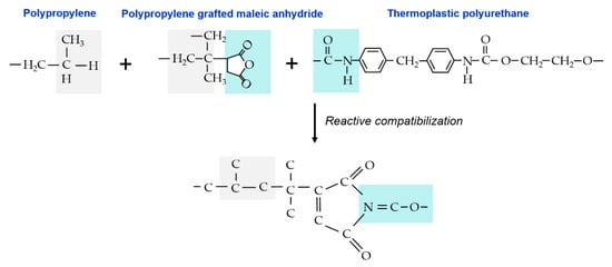 In general, the use of a single polymer cannot satisfy all demands at the same time, which makes compound polymers a remedy for modification. Subsequently, different polymers can be blended to attain a synergistic effect through the modification [10,11]. However, not all of the polymers have good miscibility and compatibility with others due to their original chemical groups and polarity, so a compatible agent is added as a bridging element [1]. It is well known that thermoplastic polyurethane consists of rigid segments and soft segments, which are individually composed of diisocyanate groups and chain extenders and polyether or polyester chains [12,13,14]. Moreover, thermoplastic polyurethane has good toughness and high mechanical properties, yet, simultaneously, its expensive cost and low thermal stability also restrict the applications by end customers [15,16,17,18,19,20]. In 2009, Young-Hee et al. concluded that the processing conditions of hot-pressing/melt mixing methods strikingly influenced the various aspects of thermoplastic polyurethane and pointed out that the thermoplastic materials could not be retreated over two or three recycling times due to its poor thermal stability. Therefore, a strategy for thermoplastic polyurethane is to find a suitable polymer that can supplement the required properties [21]. Polypropylene possesses good rigidity, good thermal stability, and a low cost [22], which qualify it to compensate for the disadvantages of thermoplastic polyurethane and, concurrently, bestow reinforcement. Thermoplastic polyurethane and polypropylene are separately a polar polymer and a nonpolar polymer; therefore, phase separation and poor phase adhesion commonly inflict thermoplastic polyurethane/polypropylene blends. With the assistance of a suitable compatibilizer, the compounds can be rid of phase separation [23]. Yang et al. indicated that maleic anhydride grafted polypropylene is a useful compatibilizer to improve the interphase problem between polypropylene and wasted rubber powder [24].