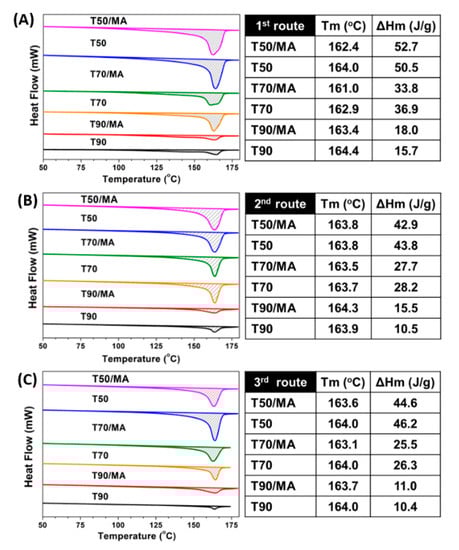 Melting behaviors in the differential scanning calorimetry (DSC) performance of T/P and T/P/MA blends as related to melt-recycling: (A) one-off hot-pressing, (B) the post-2nd-recycling, and (C) the post-3rd-recycling. Tm = melting temperature and ΔHm = melting enthalpy.