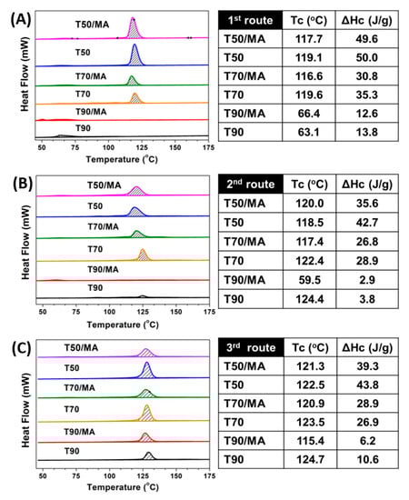 Crystallization behaviors in DSC performance of T/P and T/P/MA groups as related to melt-recycling: (A) one-off hot-pressing, (B) the post-2nd-recycling, and (C) the post-3rd-recycling. Tc is crystallization temperature and ΔHc is crystallization enthalpy.