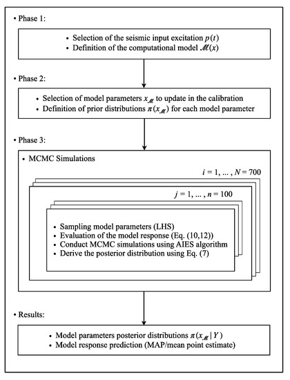 whose standard deviation was set equal to the maximum of the absolute value over the time of the experimental observation at the beginning of the calibration. The Bayesian updating is then conducted by minimizing this value (i.e., maximizing the likelihood function of Equation (6)) until the convergence of the Markov chains is reached. The obtained sample can be used to estimate output statistics by drawing samples from the posterior. Finally, having obtained model parameters posterior distributions, a deterministic model response prediction can be estimated choosing the maximum a posteriori (MAP) or the mean of the distributions as a point estimate. The aforementioned approach is summarized by the flowchart in Figure 1.