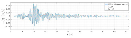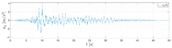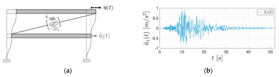 The reference model is depicted in Figure 9 with the acceleration input , while the corresponding model parameters, identified in a previous study with the Pizzoli Town Hall building responses, are reported in Table 4. For the numerical simulations, a viscous damping term (with a damping ratio of 3% set as a deterministic value in the calibration process) has been added to the model of Equation (16).