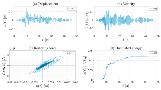Simulated reference data: (a) response displacement of the Bouc–Wen–Baber–Noori (BWBN) oscillator; (b) response velocity of the BWBN oscillator; (c) hysteresis loop of the BWBN system; (d) total dissipated energy of the BWBN system (both elastic and hysteretic components of the restoring force are gathered), normalized with respect to the mass of the oscillator.