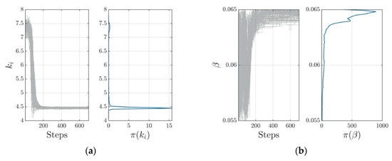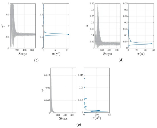 Trace plots of the Markov Chains and corresponding kernel density estimation (KDE) for each BWBN model parameter [6]: (a) ; (b) ; (c) ; (d) ; (e) .