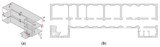 Building schematization: (a) floors schematization with sensors location; (b) plan.
