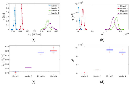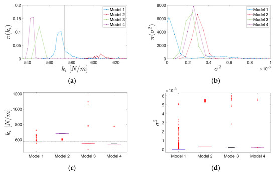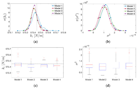 (a) Kernel density estimations (KDE) of the initial stiffness model parameter and; (b) of the discrepancy variance for each model (medium level of degradation: PGA 9 m/s2, stiffness reduction up to 80% of the initial one). (c) Boxplot representations (minimum, first quartile, median, third quartile and maximum) of the posterior samples for the model parameter and; (d) . The horizontal and vertical dotted lines in the plots represent the calibrated reference value of the initial stiffness.