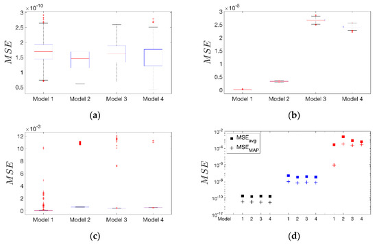 Boxplot representations (minimum, first quartile, median, third quartile and maximum) of the mean square error (MSE) computed on all the post-predictive models runs. Specifically: (a) boxplot of MSE for low level of degradation (PGA 1 m/s2); (b) boxplot of MSE for medium level of degradation (PGA 6 m/s2); (c) boxplot of MSE for high level of degradation (PGA 9 m/s2). (d) Comparison between the average MSE computed over all the post-predictive model runs for each model (square markers), versus the MSE computed for the MAP estimate (cross markers). The comparison is differentiated into three colored subsets: (i) in black, MSEs computed for a low level of degradation (PGA 1 m/s2); (ii) in blue, MSEs computed for a medium level of degradation (PGA 6 m/s2); (iii) in red, MSEs computed for a high level of degradation (PGA 9 m/s2).