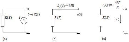(a) Resistor thermometer; the R(T) function and R value must be known and a biasing DC current I that, by unavoidably heating the thermometer causes error, is needed; (b) the usual Johnson-noise thermometry: SU is the power spectral density of the voltage fluctuations across the resistor, k is the Boltzmann constant, and T is the absolute temperature. Differently from the resistor thermometer, the R(T) function is not needed but the resistance value R must be known; (c) fluctuation-enhanced absolute thermometry based on Johnson noise and first principles: the Johnson voltage and current noise are measured (circuits b and c). The combination of the two measurements provides both the absolute temperature T and the resistance R. No heating occurs and no preliminary knowledge is needed if accurate current and voltage noise measurement systems are available.