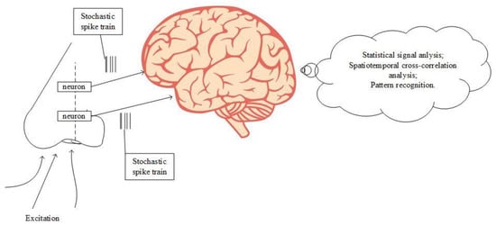 In this paper we want to focus on fluctuation-enhanced sensing of gases and odors, being a topic of great current interest for the control of environments and therefore for the protection of health. To understand the principle and the reason for resorting to FES as gas sensing technique, let us start from the observation that classical gas sensing methods are many orders of magnitude less sensitive than the best gas sensing systems we have in nature: dog noses (or even that of humans). It is therefore fundamental, as a first step, to understand how biological noses work. The operating principle of biological noses is shown in Figure 2. They contain a large array of olfactory neurons that communicate stochastic voltage spikes to the brain. When odor molecules are adsorbed by a quantity of neurons, the statistical properties of these stochastic spikes change. The brain decodes the changes in statistics and matches the result with an odor database in memory.