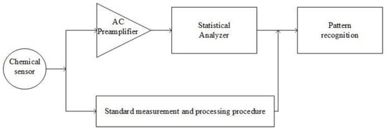 Most chemical sensors produce a single output, such as, for example, the steady-state value of the resistance of a Taguchi sensor [], or the steady-state current value of a MOS sensor. To generate a separate pattern corresponding to different chemical compositions, like in the case of electronic noses, a number (6–40) of different types of sensors are needed, which makes the system expensive and unreliable for practical applications. On the other hand, fluctuation-enhanced sensing (FES), as illustrated in Figure 3, by analyzing the fluctuations rather than the DC value, is capable of generating complex patterns even by starting from a single sensor [,,,,,,,] and this fact represents a great advantage with respect to other more conventional sensing techniques.