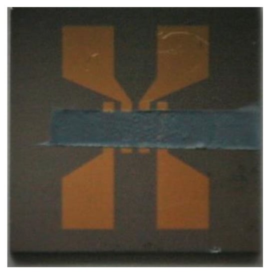 Gas sensing layer comprising TiO2 nanoparticles and graphene flakes: photo of the sensor made by painting on a silicon substrate with four-point gold contacts.
