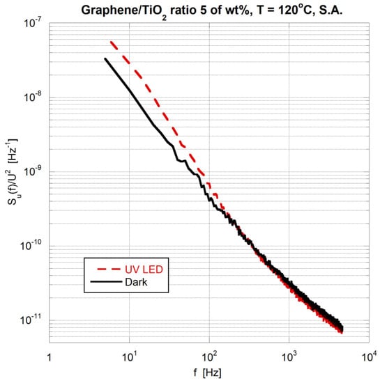 Figure 7 presents results of 1/f noise power spectral density generated in the thick gas sensing layer shown in Figure 6. The sensor was irradiated by UV LED, having maximal optical power at the wavelength of 394 nm. Both materials (graphene flakes, TiO2 nanoparticles) are gas-sensitive and both exhibit the photocatalytic effect. The gas sensing layer has a very porous structure. A vivid change of power spectral density slope versus frequency was observed when UV light was applied. The intensified plateau of power spectral density was present about 10 Hz after irradiation. This effect can be explained by modulation of adsorption-desorption rate induced by UV light, making these processes faster and more intense. By increasing power of UV light (decreasing its wavelength), changing morphology of gas sensing layer (e.g., changing a graphene flakes/TiO2 ratio of wt%), and reducing a thickness of the gas sensing layer it is possible to strengthen this effect. More visible changes of plateau can be observed at lower operating temperatures when the energy of UV light had a greater impact on adsorption-desorption process.