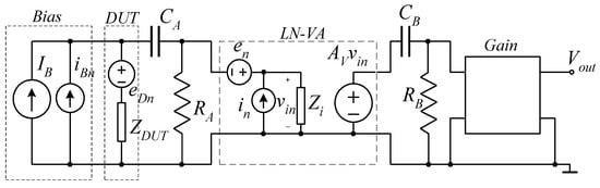To overcome the problems evidenced in Section 5.4, dedicated instrumentation may be the optimal choice. To discuss the options that are available for the design of dedicate instrumentation, it can be useful to divide the possible measurement set-ups into two main categories, as quite different issues must be addressed in the two cases: Voltage Noise Measurements (VNM) and Current Noise Measurements (CNM). A block diagram of basic set ups for VNM and CNM in the case of a two terminals device (DUT) are shown in Figure 8 and Figure 9, respectively. In the case of VNMs, the DUT is supplied with a constant current. If the input impedance of the Low Noise Voltage Amplifier (LN-VA) is sufficiently large and its Equivalent Input Current Noise (EICN) is sufficiently low, the DC component due to the bias can be removed before the input of the LN-VA that can be therefore DC coupled and, at the same time, characterized by high gain [,,]. Typical gains for the LNVA stage are in the order of 40 dB. A second AC filter can be used to remove the offset at the output of the LNVA prior to the input to a second stage that acts as a gain stage to ensure a good coverage of the dynamic range of the signal sampler used to record and analyze the output signal. Due to the large gain of the first stage, the gain stage can often be realized employing low noise Operational Amplifier (OA) based amplifiers. On the other hand, the Equivalent Input Voltage Noise (EIVN) at the input of the LN-VA amplifier sets the ultimate level to the Background Noise (BN) that can be reached and, therefore, it is often obtained by resorting to discrete large area Junction Field Effect Transistors (JFETs) as the first amplifying device. Regardless of the particular architecture chosen for the realization of the LN-VA, the fact that it is based on discrete devices means that the output offset can be quite large, hence the need for a second AC coupling stage between LN-VA and the second stage [,,]. When dimensioning the first AC coupling stage, attention must be paid to the fact that the resistance RA introduces noise that may increase the BN of the system. Assuming that RA can be made much larger than the DUT impedance, the thermal noise generated by RA is filtered by the coupling capacitance CA. In order to take full advantage of the low noise of the first stage the noise contribution coming from RA must become negligible at the minimum frequency of interest fmin, and this means, as it is discussed in [,], that the frequency corner of the AC filter must be much smaller than fmin. The resulting long time constant may cause transients that are very long (in the order of minutes) if fmin is in the hundred mHz range. Assuming the EICN of the LN-VA to be negligible and its input impedance to be extremely large, at frequencies at which the presence of the AC coupling filter can be neglected (both in terms of frequency response and noise contribution from RA), we have that the voltage at the input of the LN-VA can be written as: