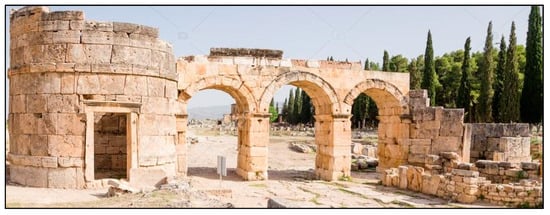 Under the auspices of the Flavian proconsul Sextus Iulius Frontinus, a monumental gate was built at the northern edge of the city, in the first century AD, and the adjacent part of the main street was extended and framed by a Doric colonnade []. The gate has three openings in squared travertine blocks, with masonry arches, flanked by two round towers. Under the directorship of Paolo Verzone from the Turin Polytechnic Institute, the Missione Archeologica Italiana (MAIER) was set up in 1957, and restorations on the Frontinus Gate progressed []. Archaeological surveys have been carried out in the urban area and in the territory surrounding the ancient city to collect information []. The Frontinus Gate, which is the monumental entrance to Hierapolis (Figure 1), suffered damage from earthquakes in the fourth and seventh centuries, after which some reconstruction interventions were applied [,]. One of the towers of the opening is still in good condition today. Almost half of the other tower collapsed and was damaged from destructive earthquakes and other natural disasters. Since 1988, the site has been included in the UNESCO World Heritage List with emphasis on the extraordinary natural conditions, the Greco-Roman thermal installations, and the Christian monuments []; thus the Frontinus Gate and other monuments at the site have great importance in providing the present generation a connection to its past.