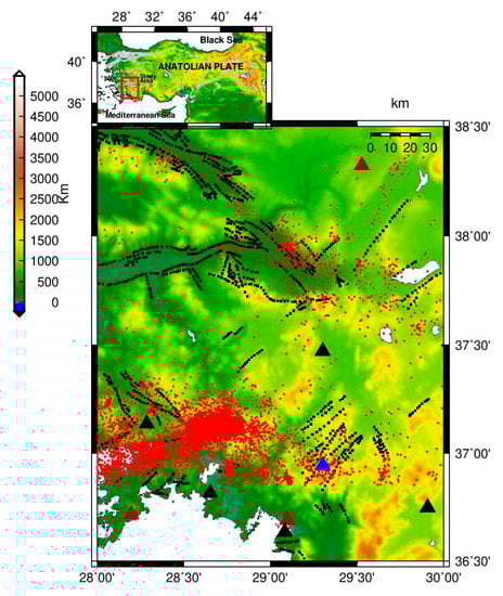 The present tectonic structure of Turkey has been formed by active interactions developed by the continental collision of the Arabian plate with the Eurasian plate in the east, and subduction of the African plate beneath the Aegean [,]. These tectonic motions caused the development of two significant active faults, the North Anatolian Fault (NAF) and the East Anatolian Fault (EAF), and the westward extrusion of the Anatolian plate. Another result of the motion is the ongoing lithospheric scale extension caused by trench roll-back in the Hellenic subduction zone [,]. As a consequence of the active tectonic motions, strong extensional deformation developed in western Anatolia.
