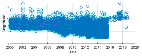 Distribution of earthquakes with their magnitudes from 2000 to 20 December 2018.