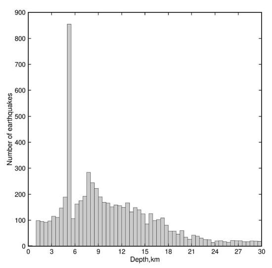 As seen in Figure 3, the magnitude range of most of the earthquakes in this region is from 2 to 4. This indicates that active crustal movements and numerous outflow thermal waters are responsible for high micro-seismic activity. Denizli is one of the most seismic regions in Turkey. Figure 4 shows the number of earthquakes with depth distribution for Denizli. As mentioned, Denizli was destroyed by an earthquake with a magnitude of 4.7 on 19 August 1976. Although it was a moderate earthquake, it resulted in the collapse of 40 houses and heavy damage to 1284 houses [].