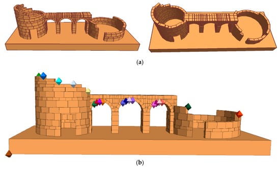 The average mechanical properties of the Frontinus Gate were determined using information inferred from previous studies mentioned above and considered obvious damage. In this study, elasticity and shear modulus were assumed as 2800 MPa and 860 MPa, respectively. The numerical model was created with the discrete element method code 3DEC [], widely used in masonry models [,,,,,,,,,,,,,]. 3DEC represents the discontinuous medium as an assemblage of discrete blocks, with the discontinuities treated as interfaces between the blocks. 3DEC allows large displacements and rotations of blocks, thus being able to simulate structural collapse. In this study, rigid blocks have been employed, as often done in the analysis of structures made of strong stone units, for which deformation and failure modes are governed by sliding or separation along discontinuities [].