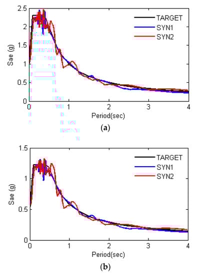 (a) Comparison of target response spectrum for ground motion level 1 with corresponding synthetic earthquake; (b) Comparison of target response spectrum for ground motion level 2 with corresponding synthetic earthquake.