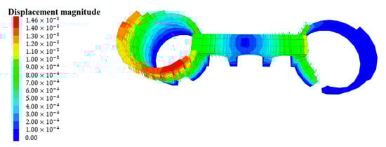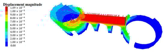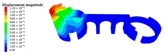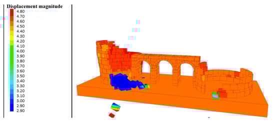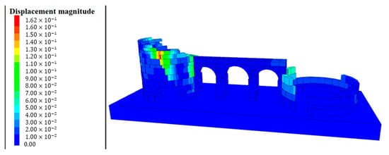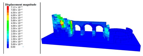In the analysis of the response under seismic action, the nonlinear properties of the joints were applied. First, static analysis was carried out under self-weight. Then, nonlinear dynamic analyses were performed under seismic loading. For the Dinar, Turkey 1995 earthquake with a duration of 29 s and increments of 0.005 s, the masonry gate model experienced the seismic excitations in horizontal and vertical directions simultaneously. The structural response of the numerical model subjected to the Dinar earthquake in terms of contour diagram of the final displacement magnitude is presented in Figure 11. As is seen in this figure, the displacements increase along the height of the round tower and the maximum displacement of 7.1 cm is obtained, particularly in areas where the normal stresses are low. The connection of the round tower with the arched gate is also a critical location.